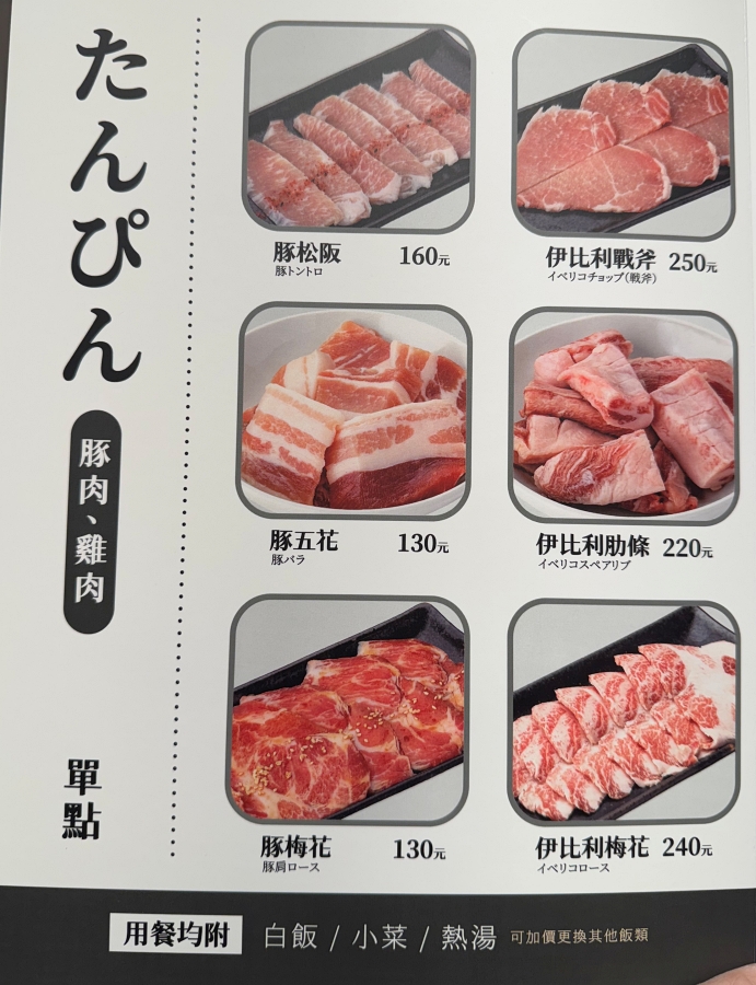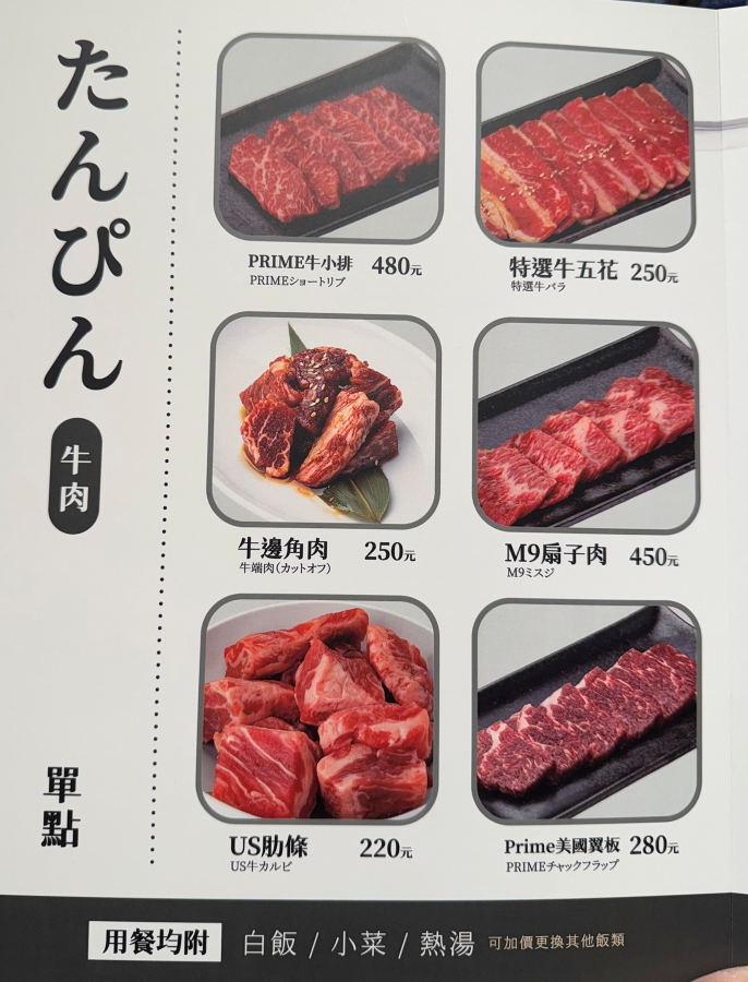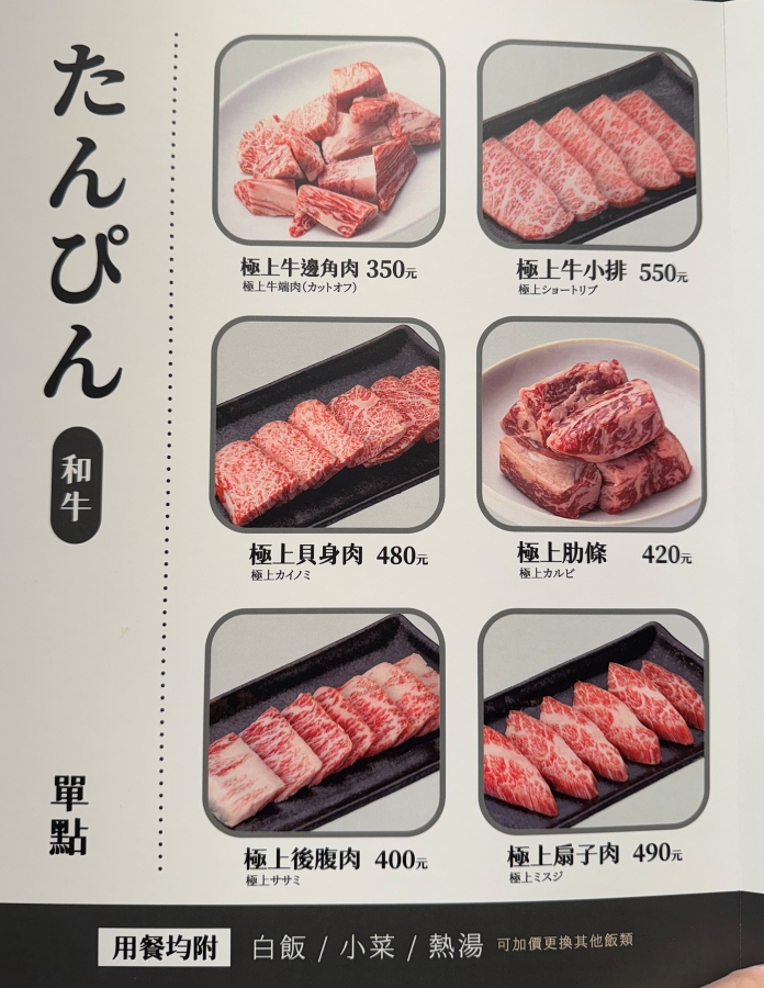 貝身肉,牛小排,和牛肋條,極上扇子肉,後腹雪花