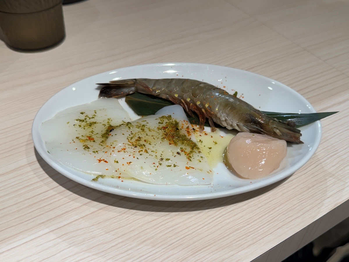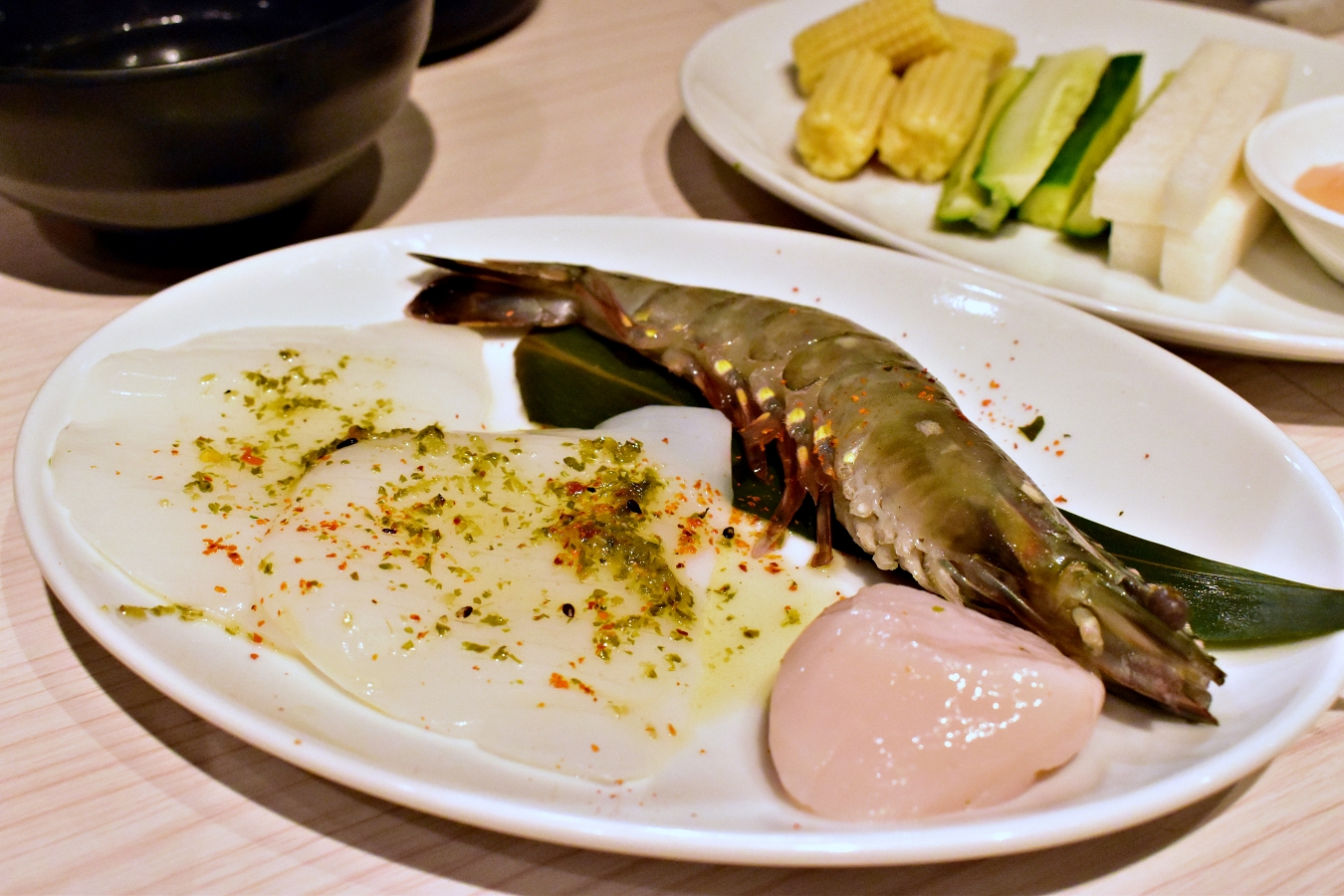 這個是加購搭配的海鮮,這一次是草蝦,紋甲花枝,北海道干貝。