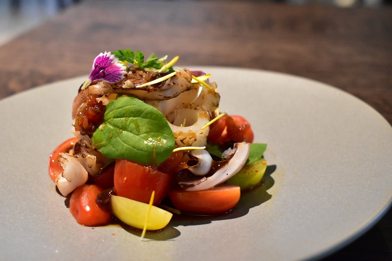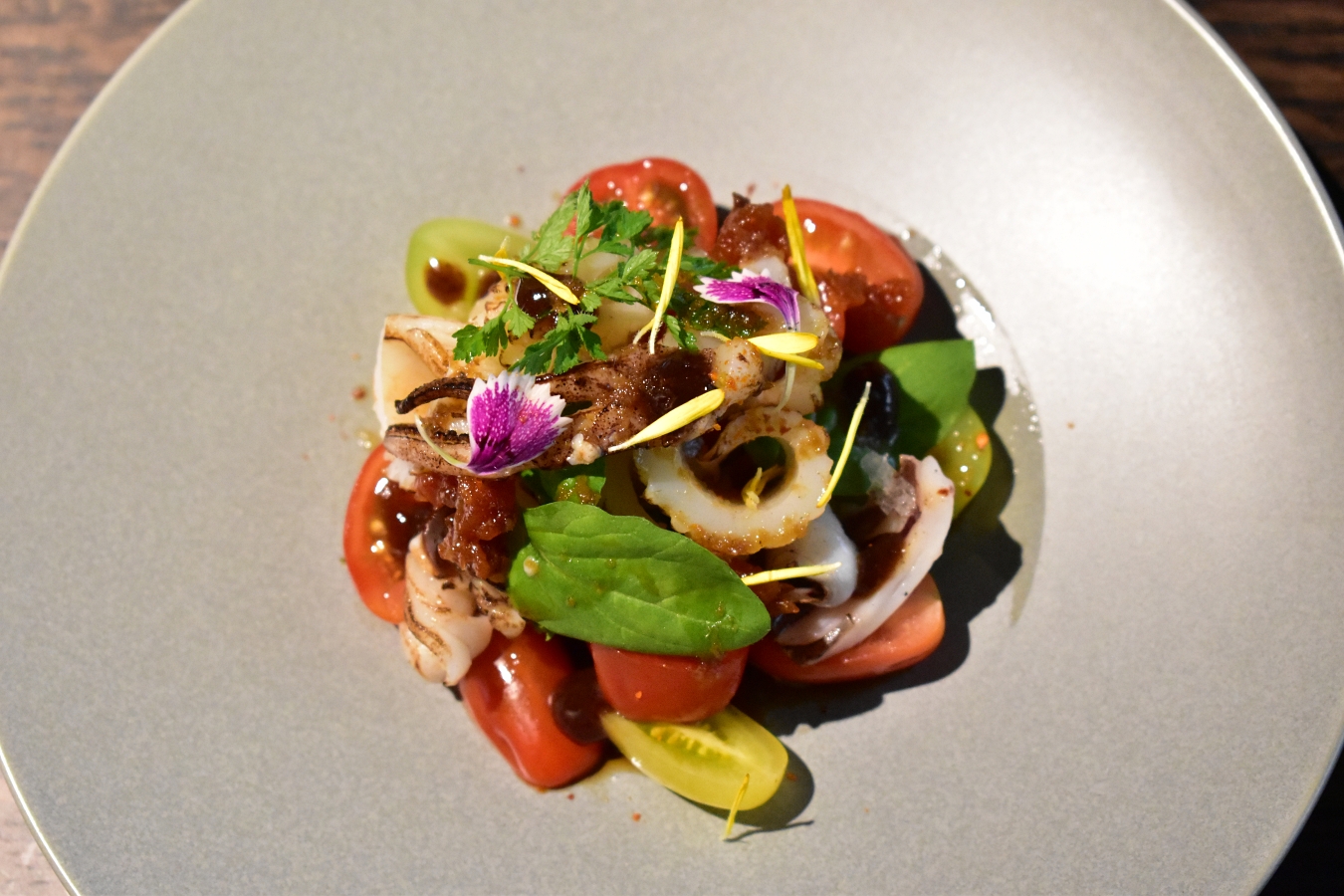 用上了五顏六色的彩色小番茄,搭配上炙燒過的小卷。