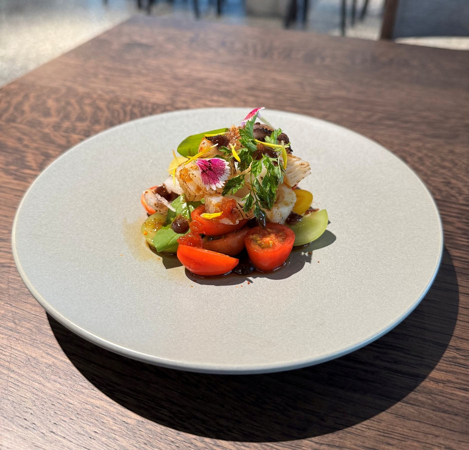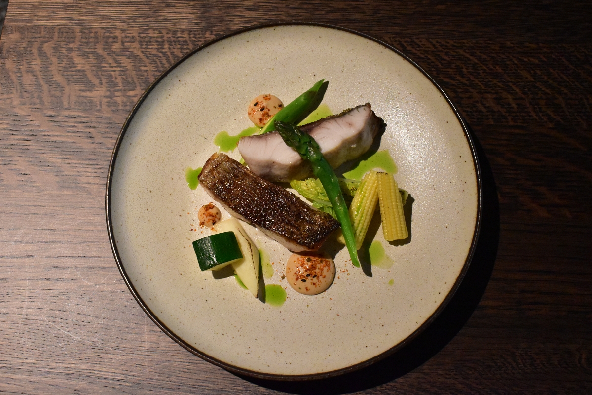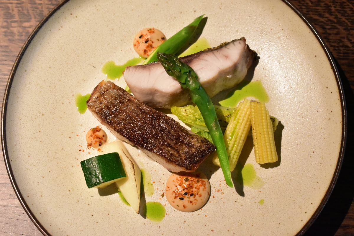 主餐的煎海鱺與開胃菜的小卷搭古早味番茄無疑是這一次的亮點,