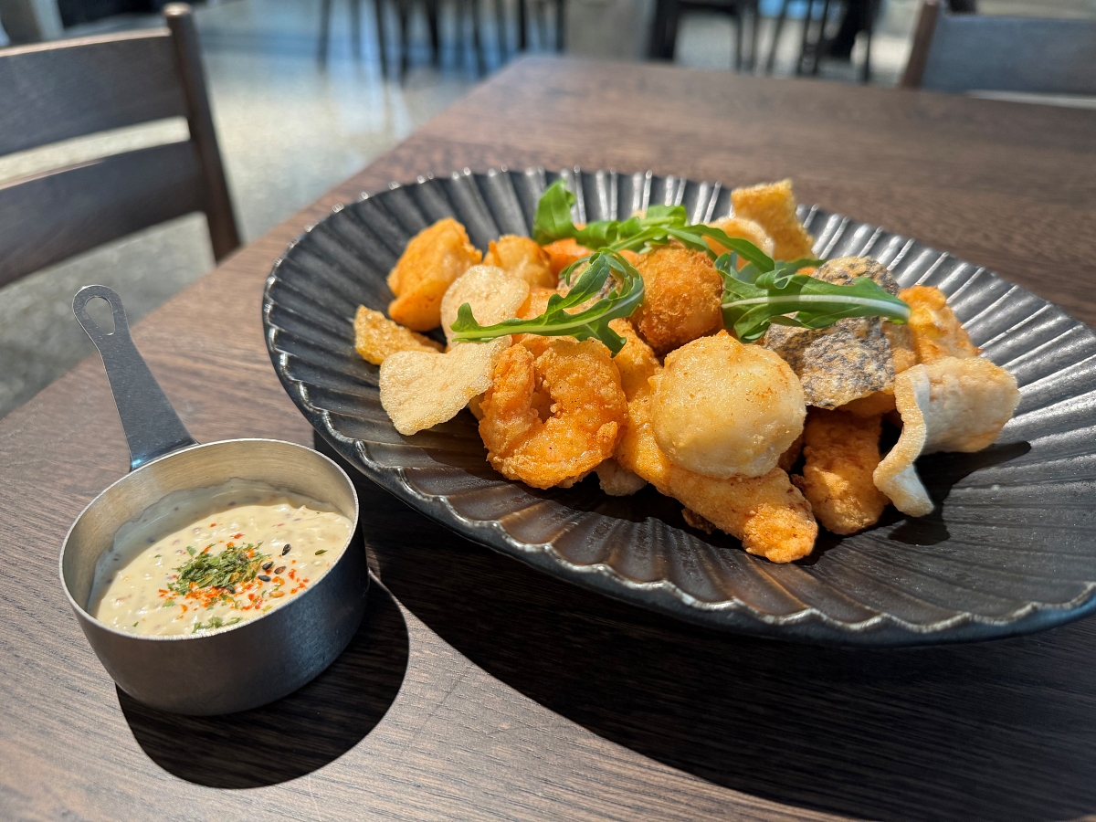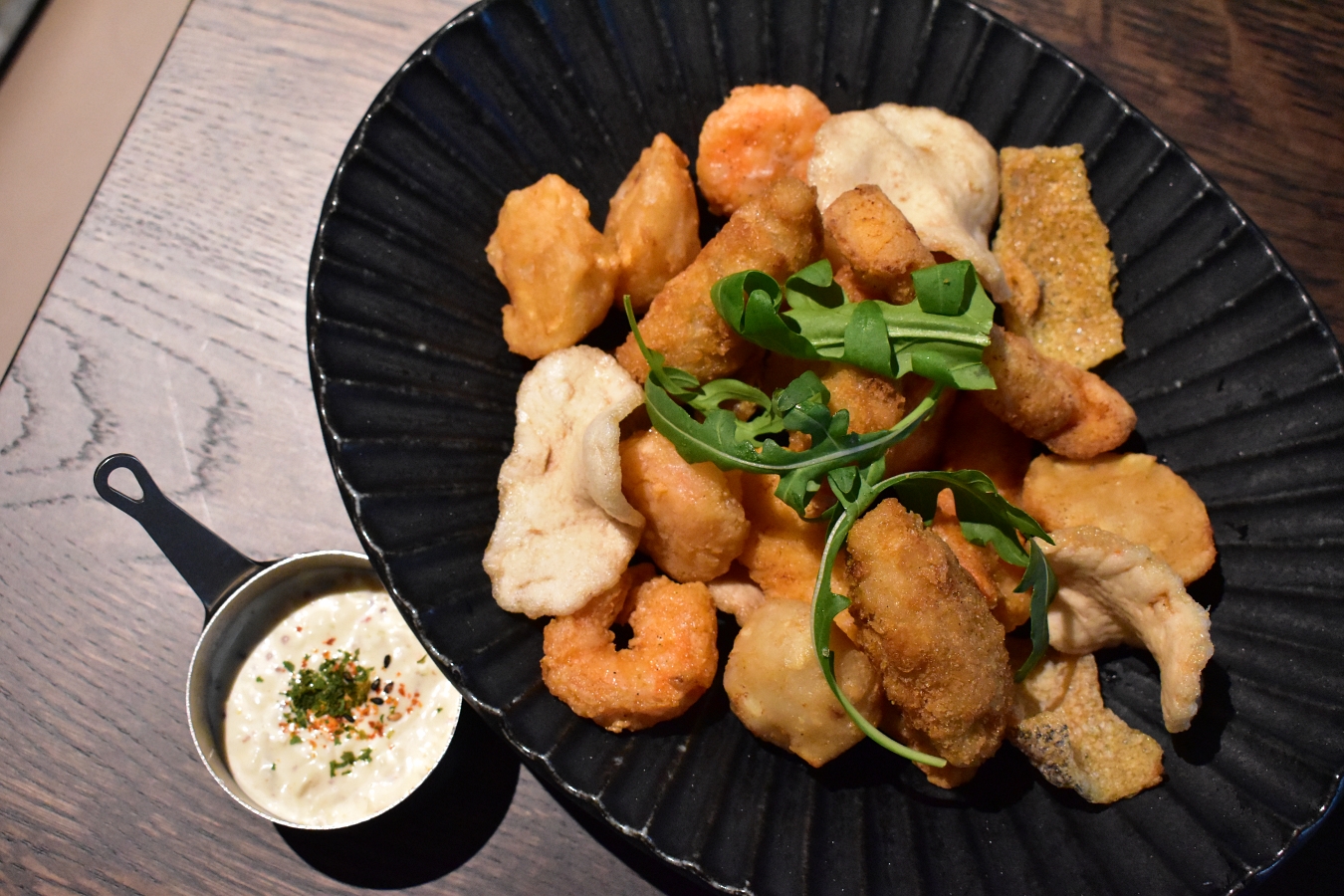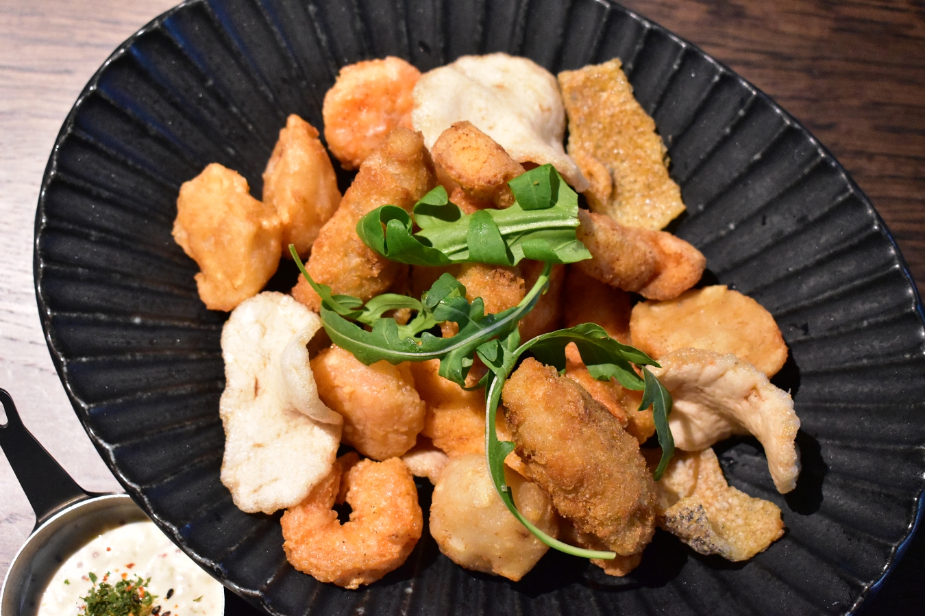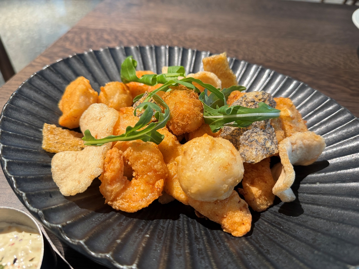 這一份酥炸海鮮之中有白蝦,蝦餅,龍虎石班,牡蠣,花枝丸等海鮮。