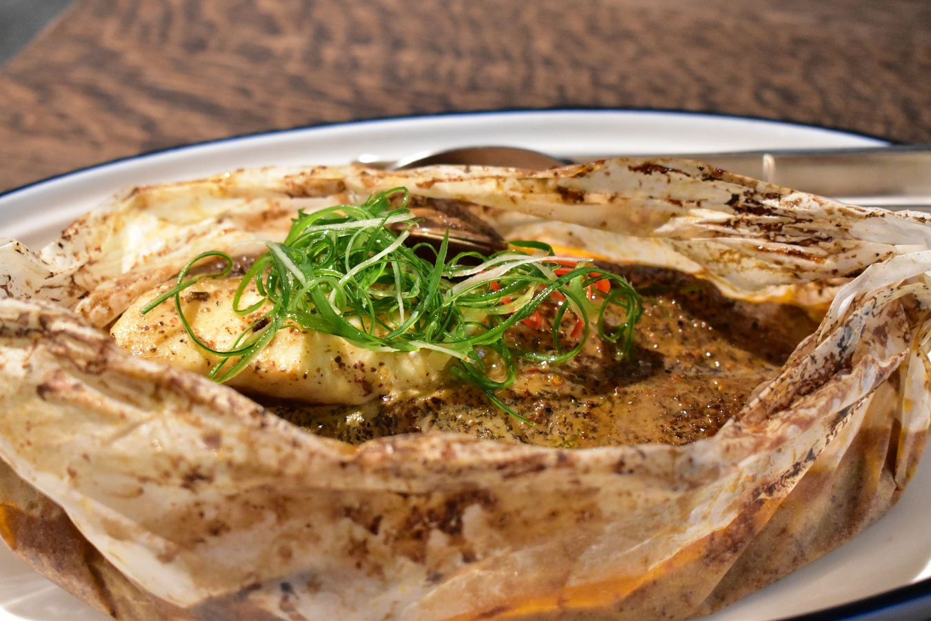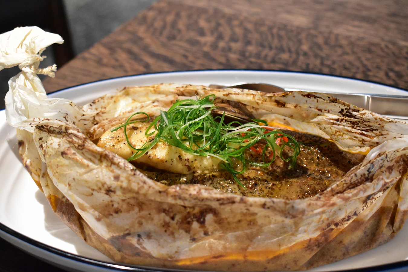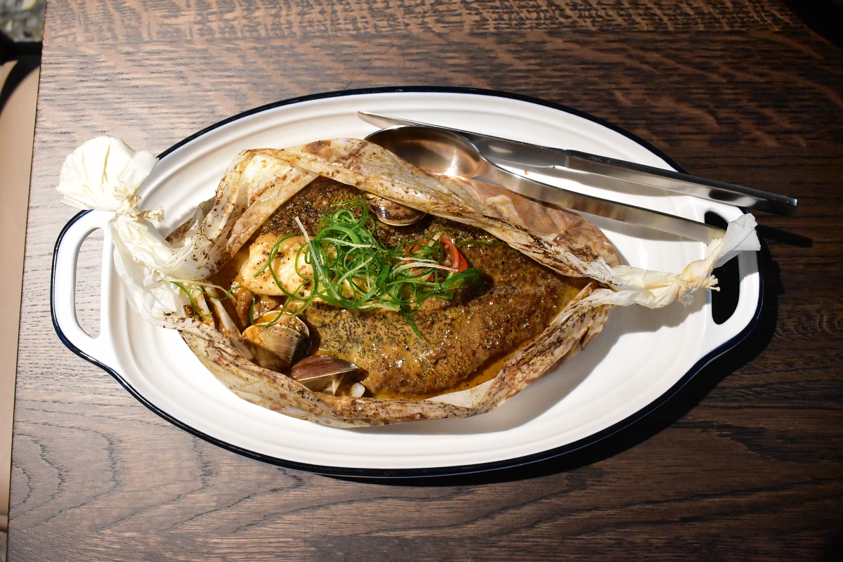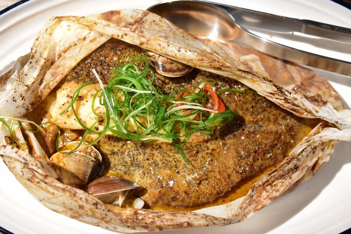 紙包魚用的是龍虎石班,裏頭還有蛤蜊,馬鈴薯,黃豆芽,