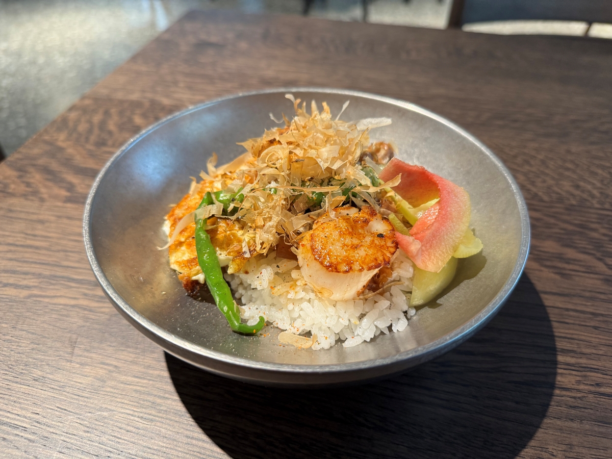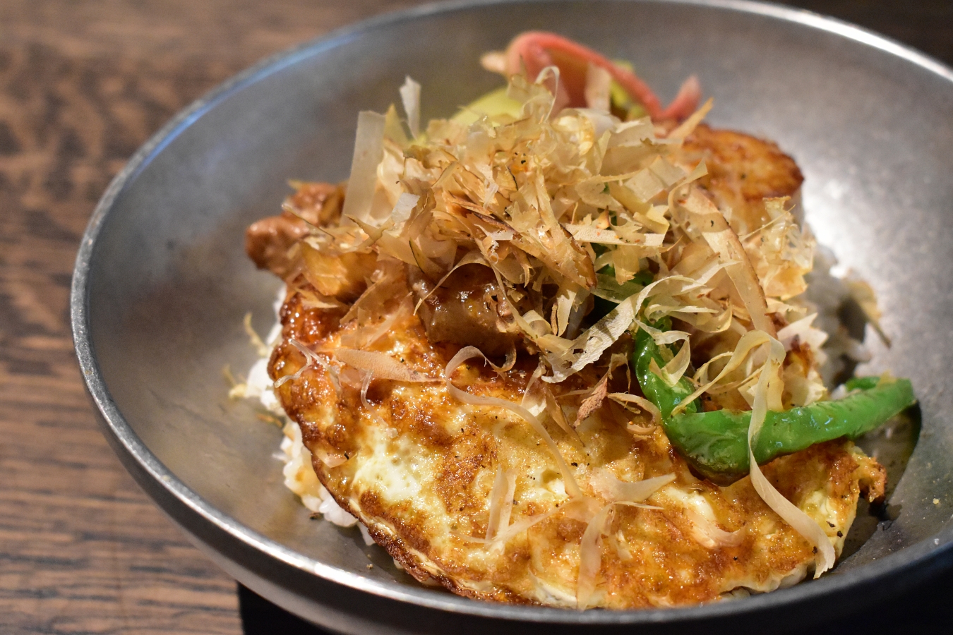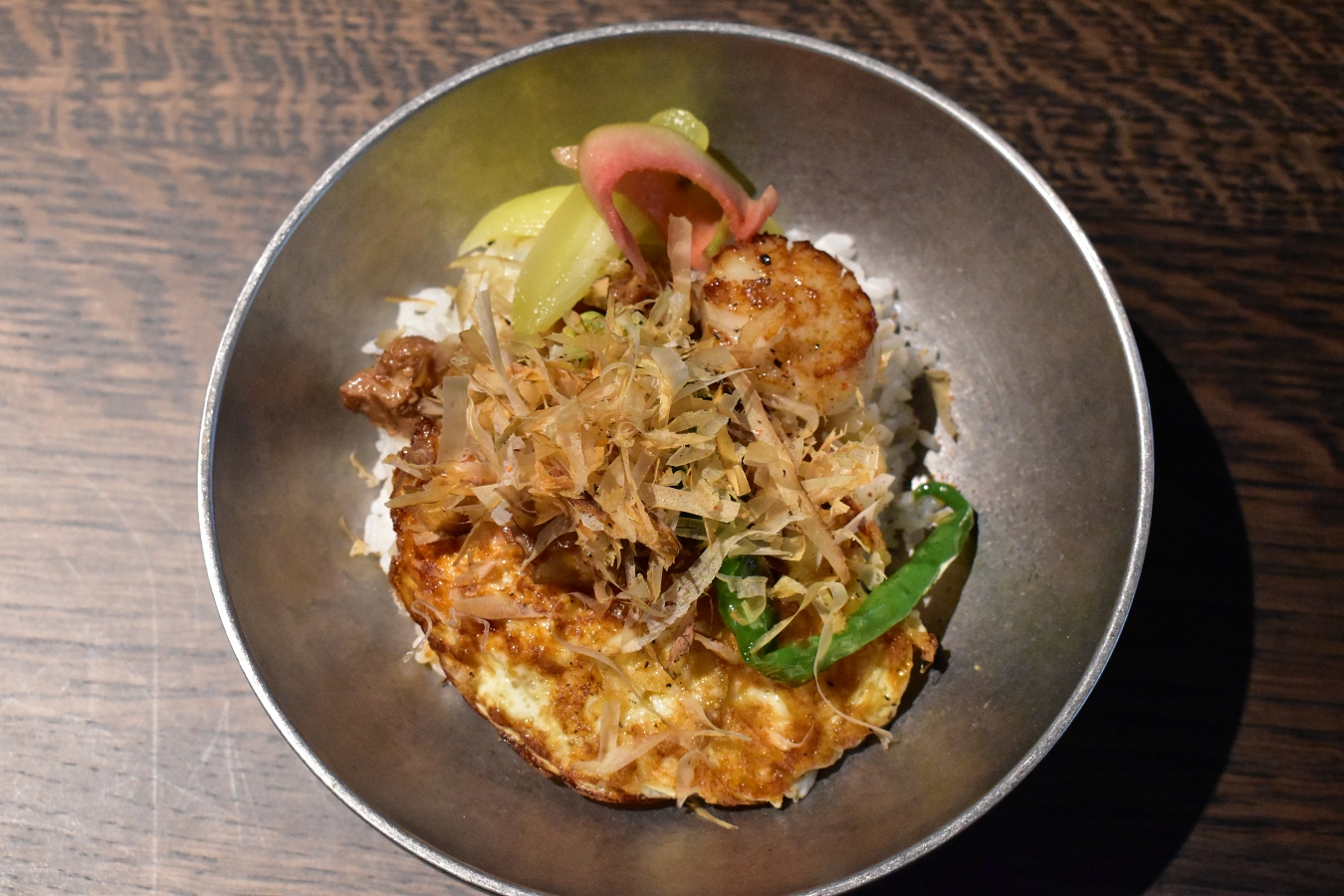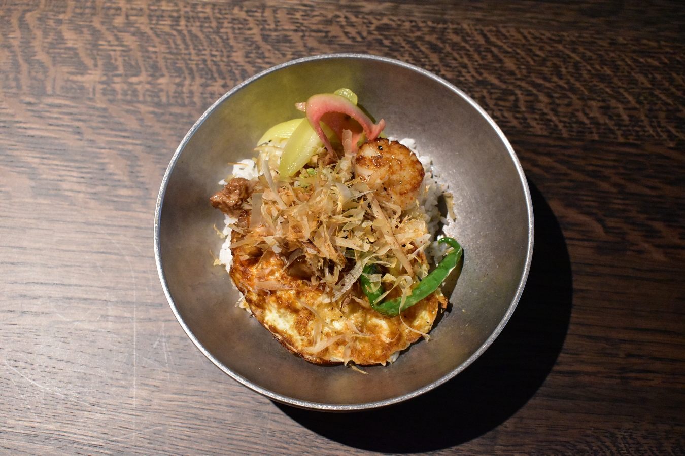 以黑鮪魚做成的滷肉飯,還有放上一顆半熟蛋,大干貝,柴魚片,青龍椒,