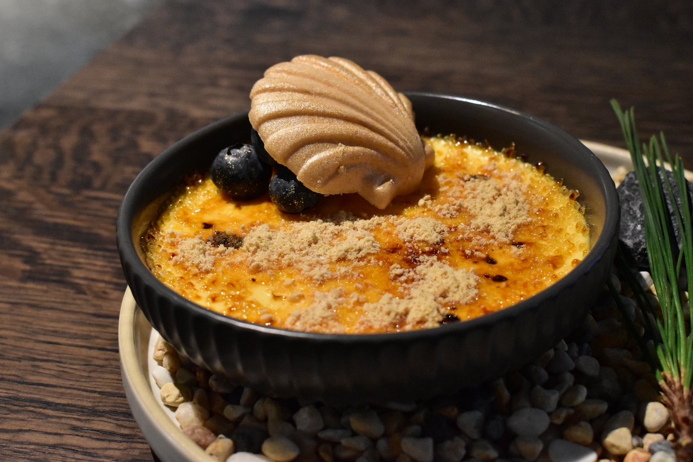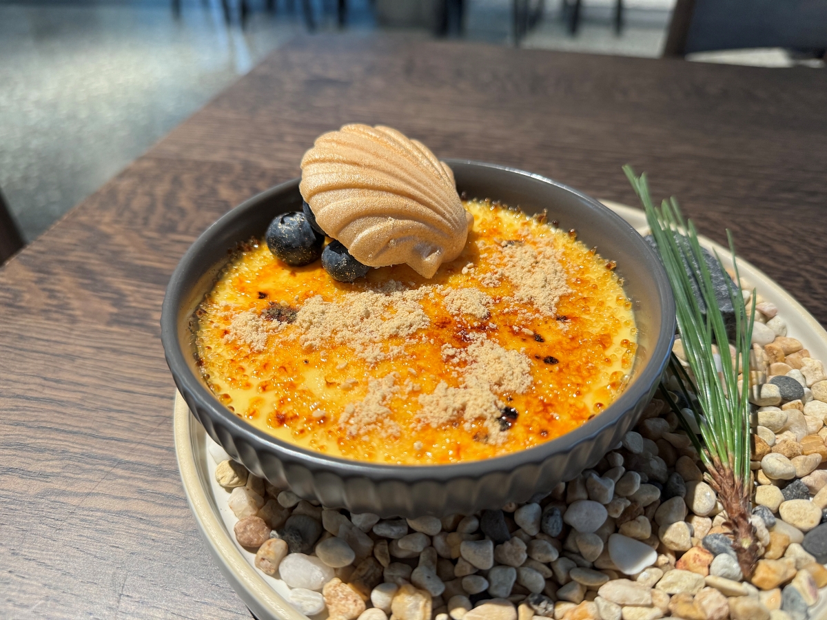 焦糖烤布蕾上頭撒上了麵茶粉增加了點不同的香氣,