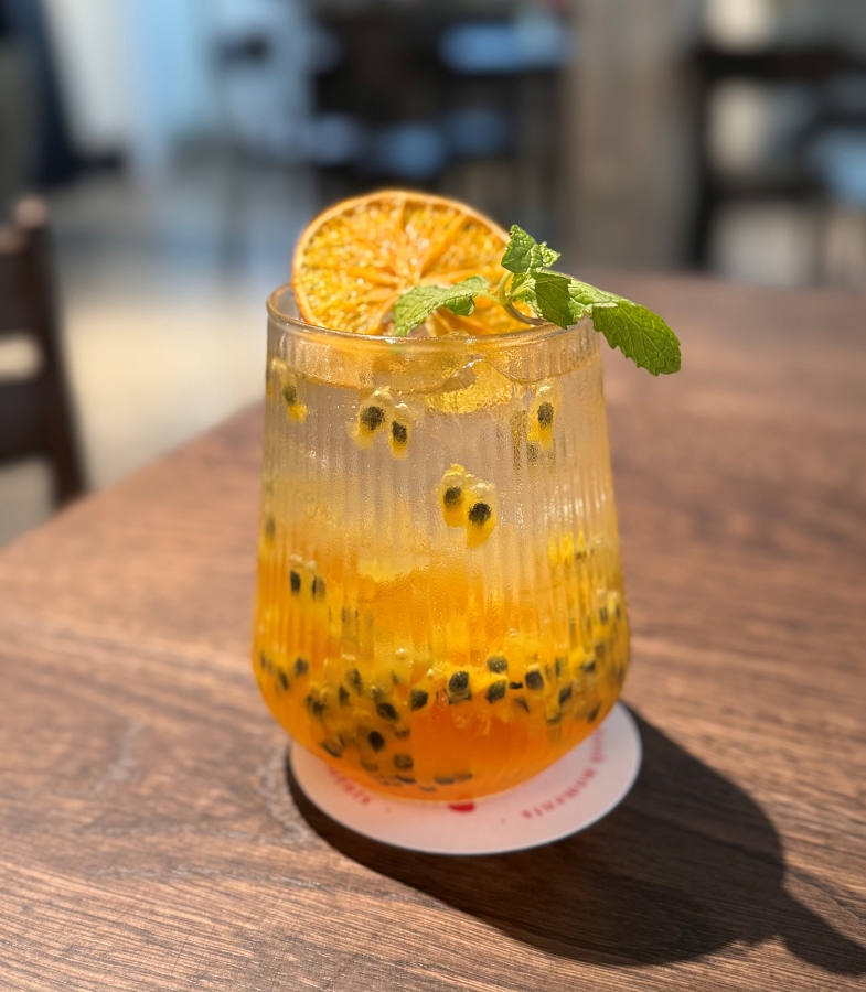 這杯加入了白桃跟百香果,做成的氣泡飲,