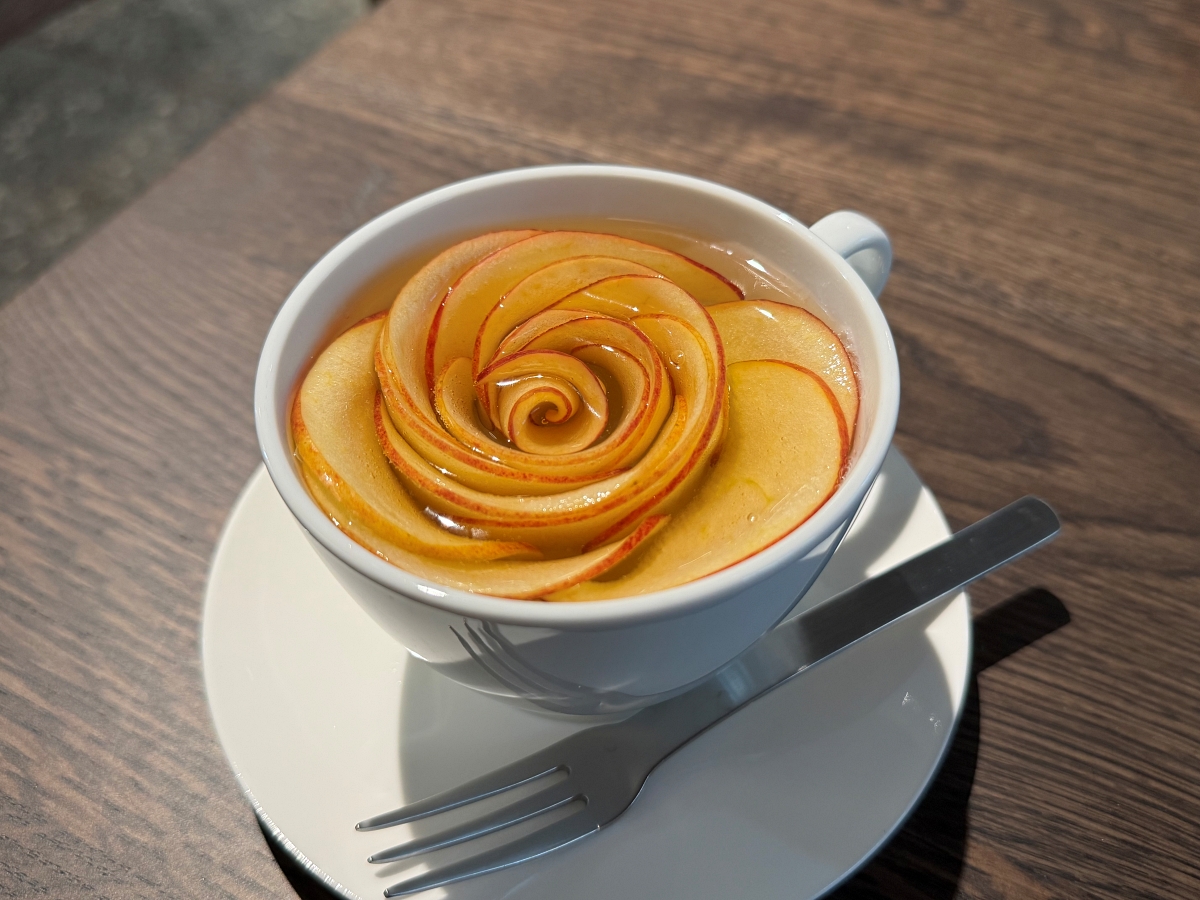用上了切成花的蘋果,搭配上龍眼花茶,淋上去的時候就會有一種開花的感覺。