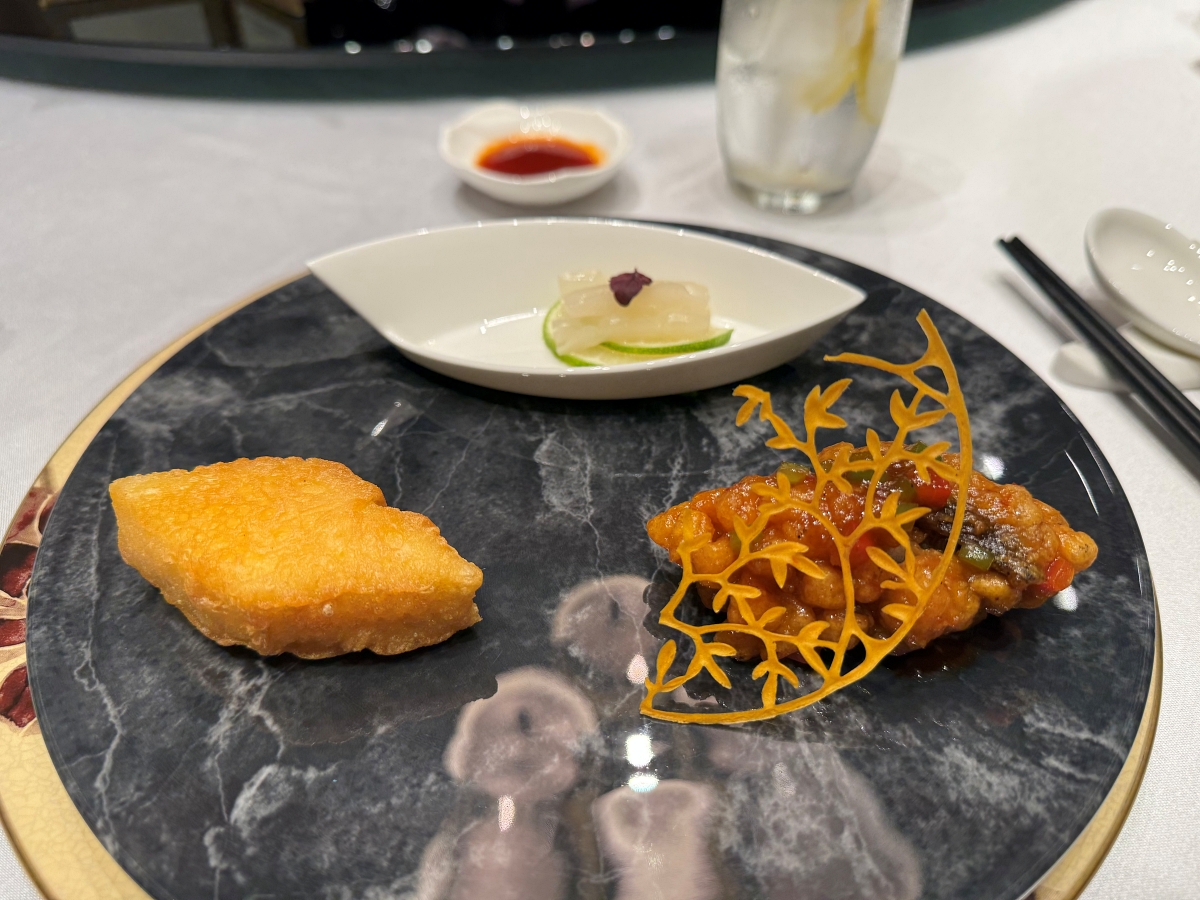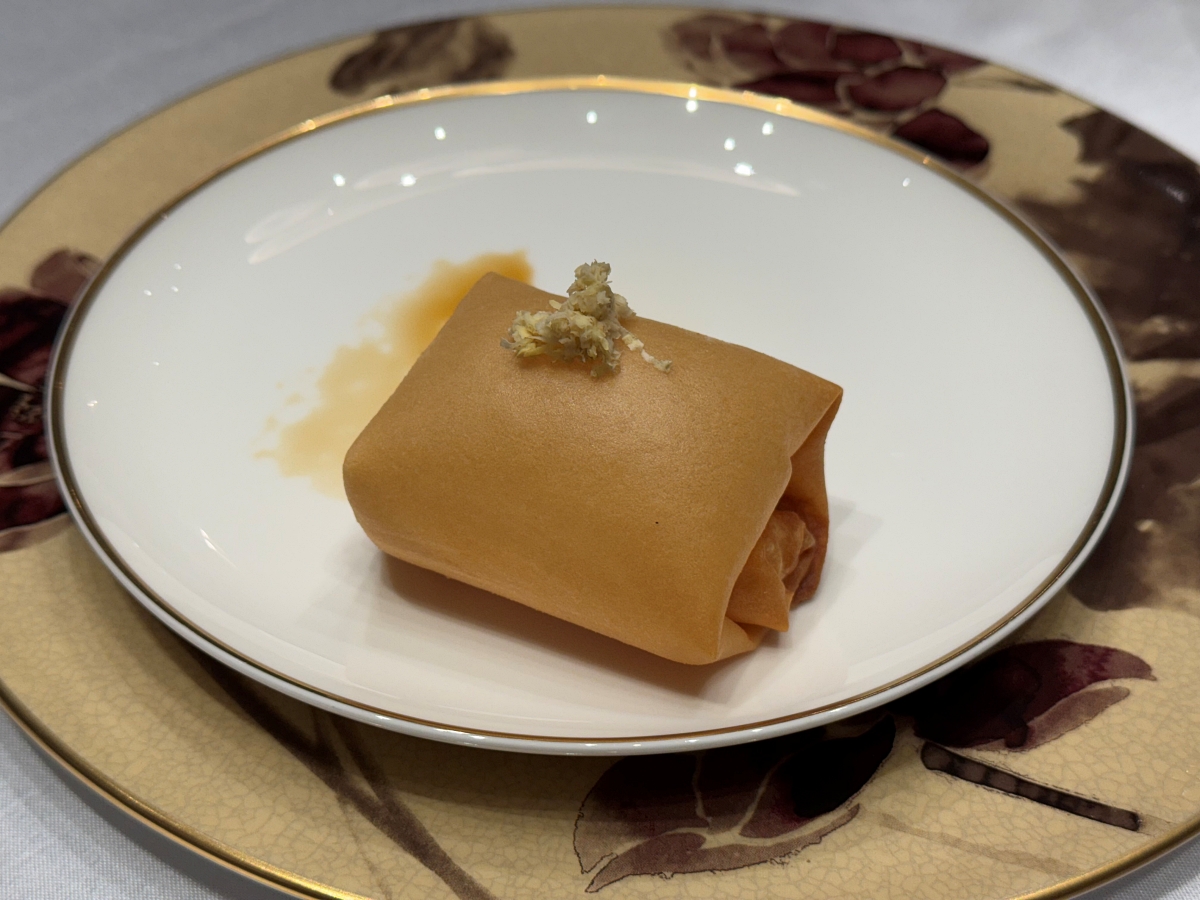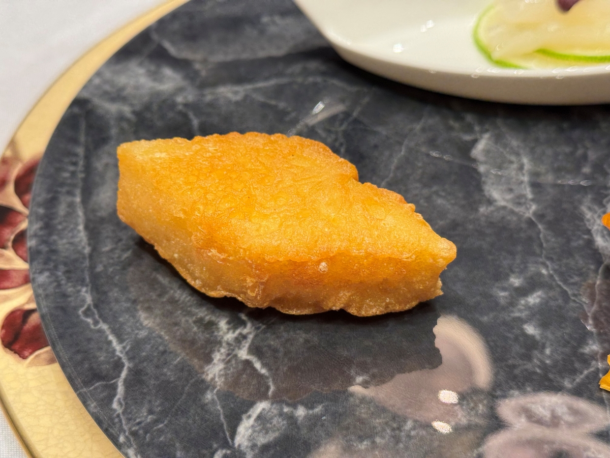 這個比較像是空心的炸春捲,底下只有薄薄的一層蝦泥,上頭刨上了點栗子絲。