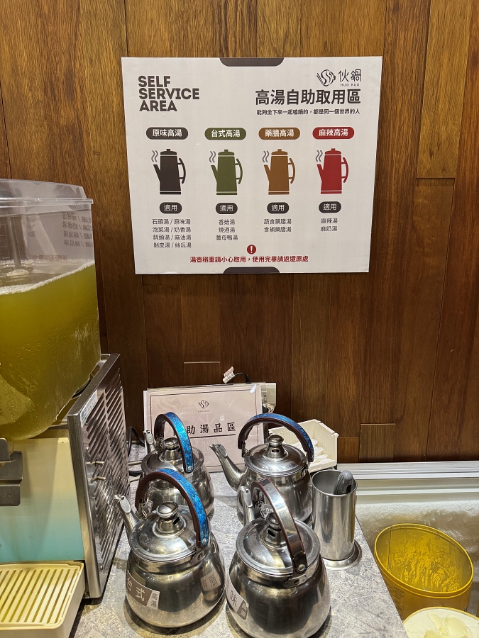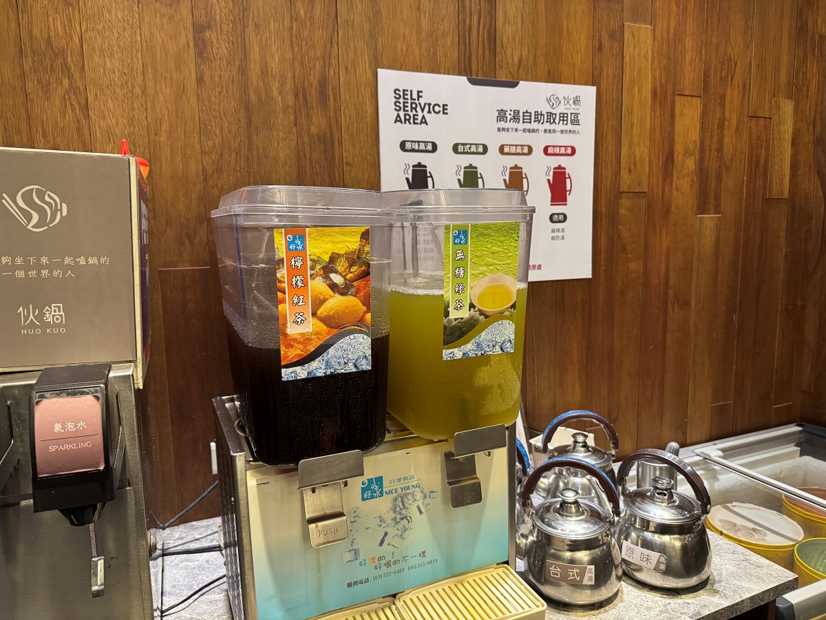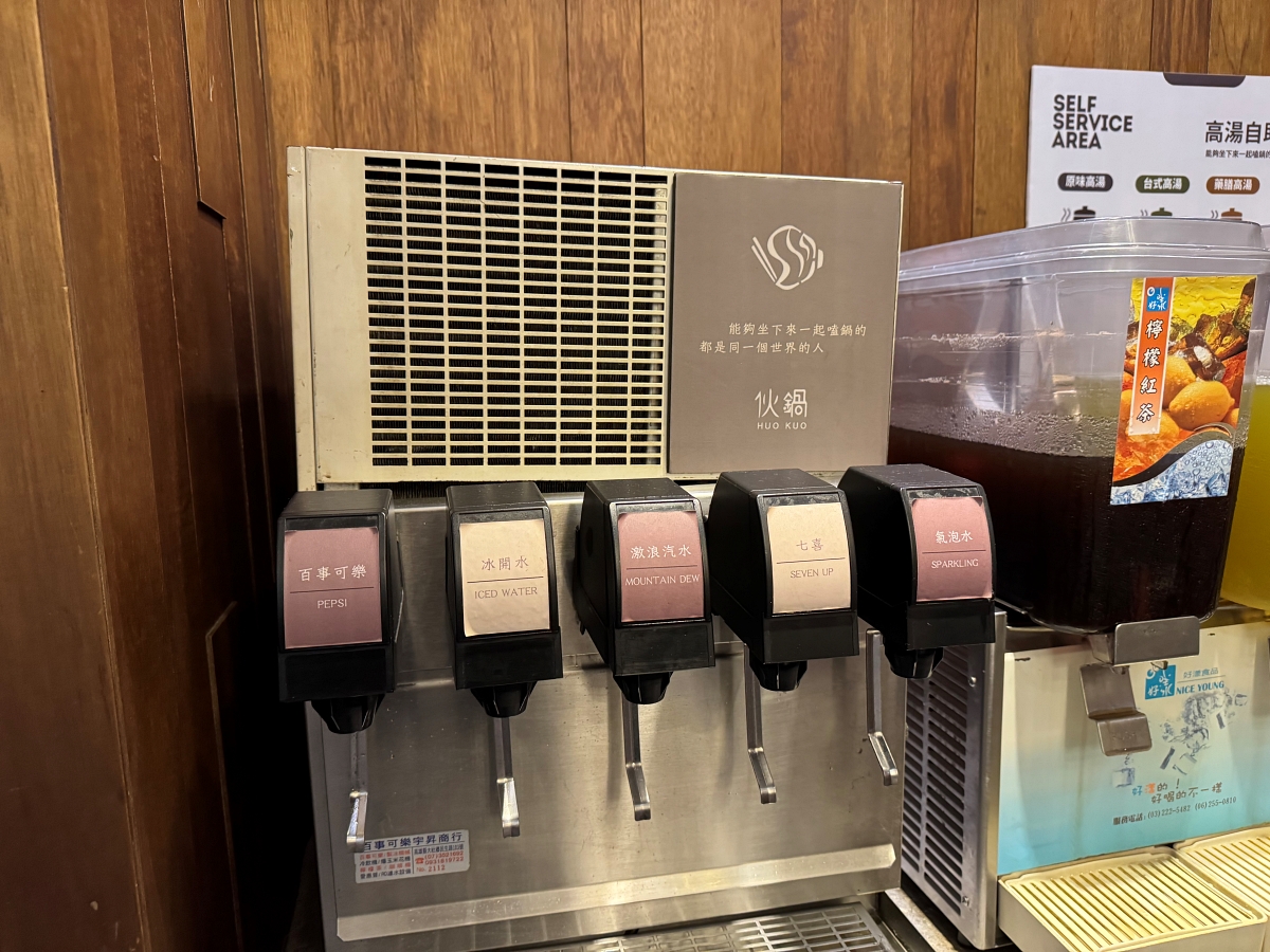 但是如果不要看上旁邊那五顏六色的茶水機,我還滿喜歡伙鍋 Huo Kuo這樣汽水機的配色。
