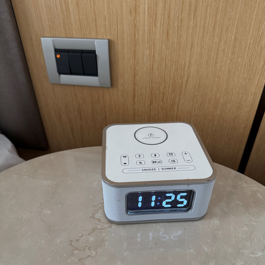 旁邊的床頭櫃上有一個無線充電的時鐘,