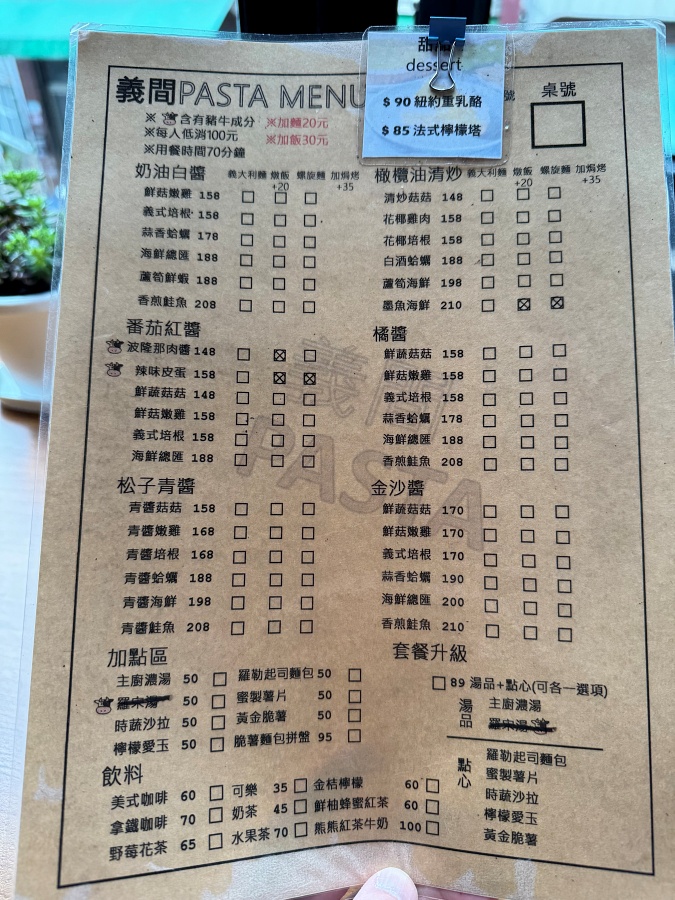 義間PASTA 屏東豐榮店的菜單不複雜,就是義式料理小店會看到的菜單,