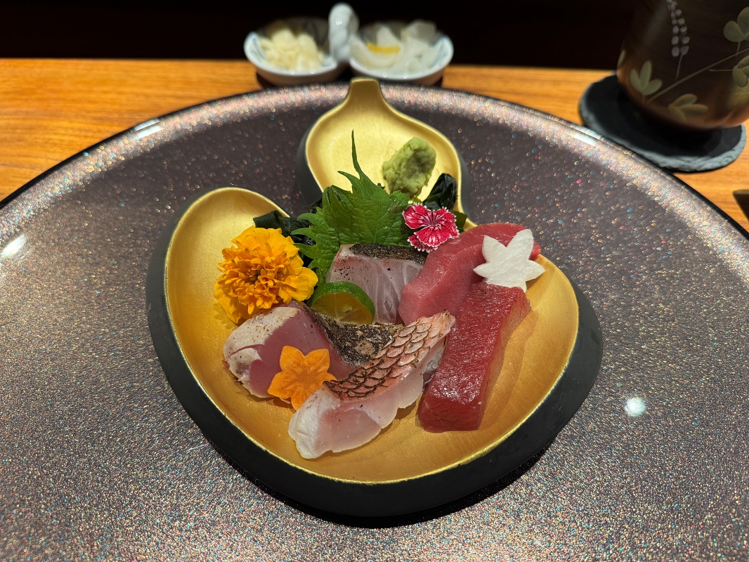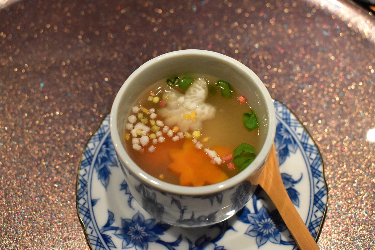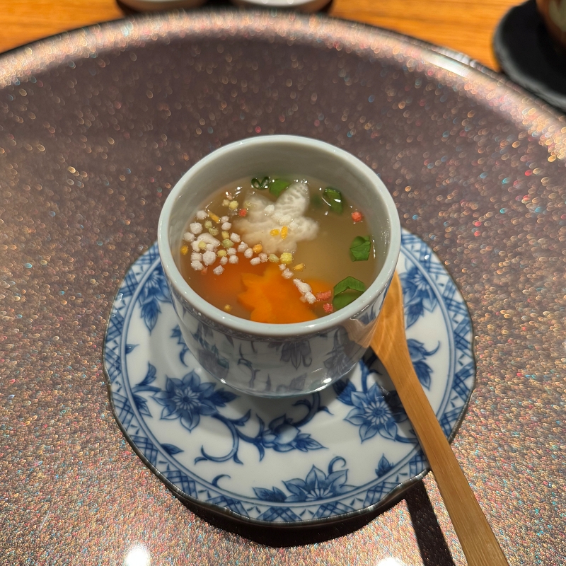 上頭則是白蘿蔔跟紅蘿蔔的雕花跟日式脆米。