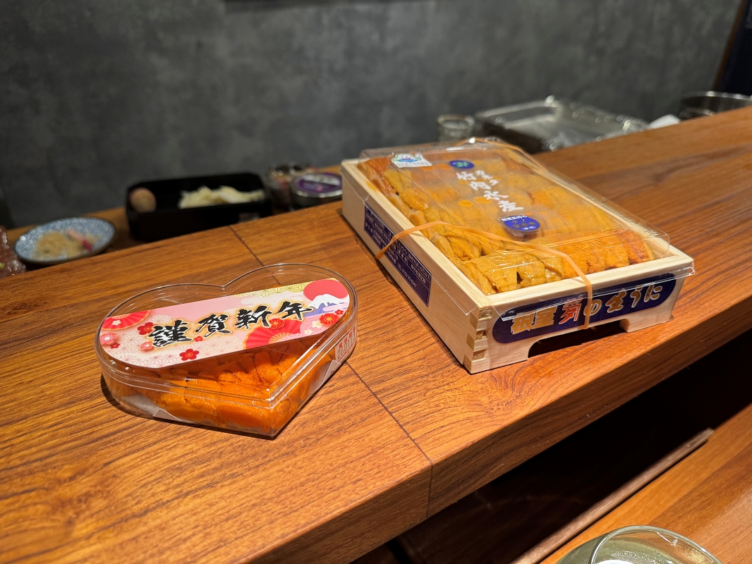 師傅展示了等等會用在海鮮丼上的兩種海膽。