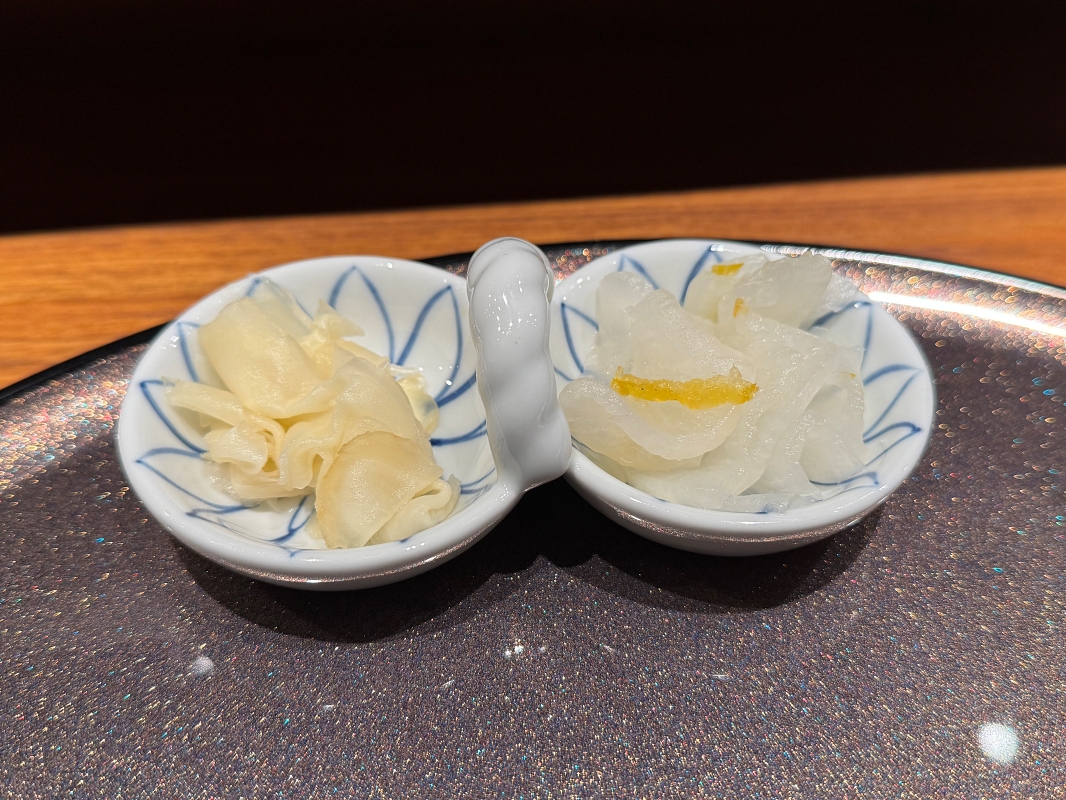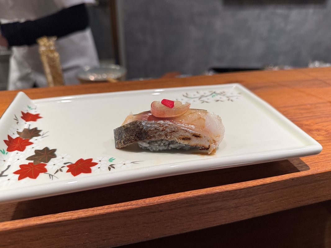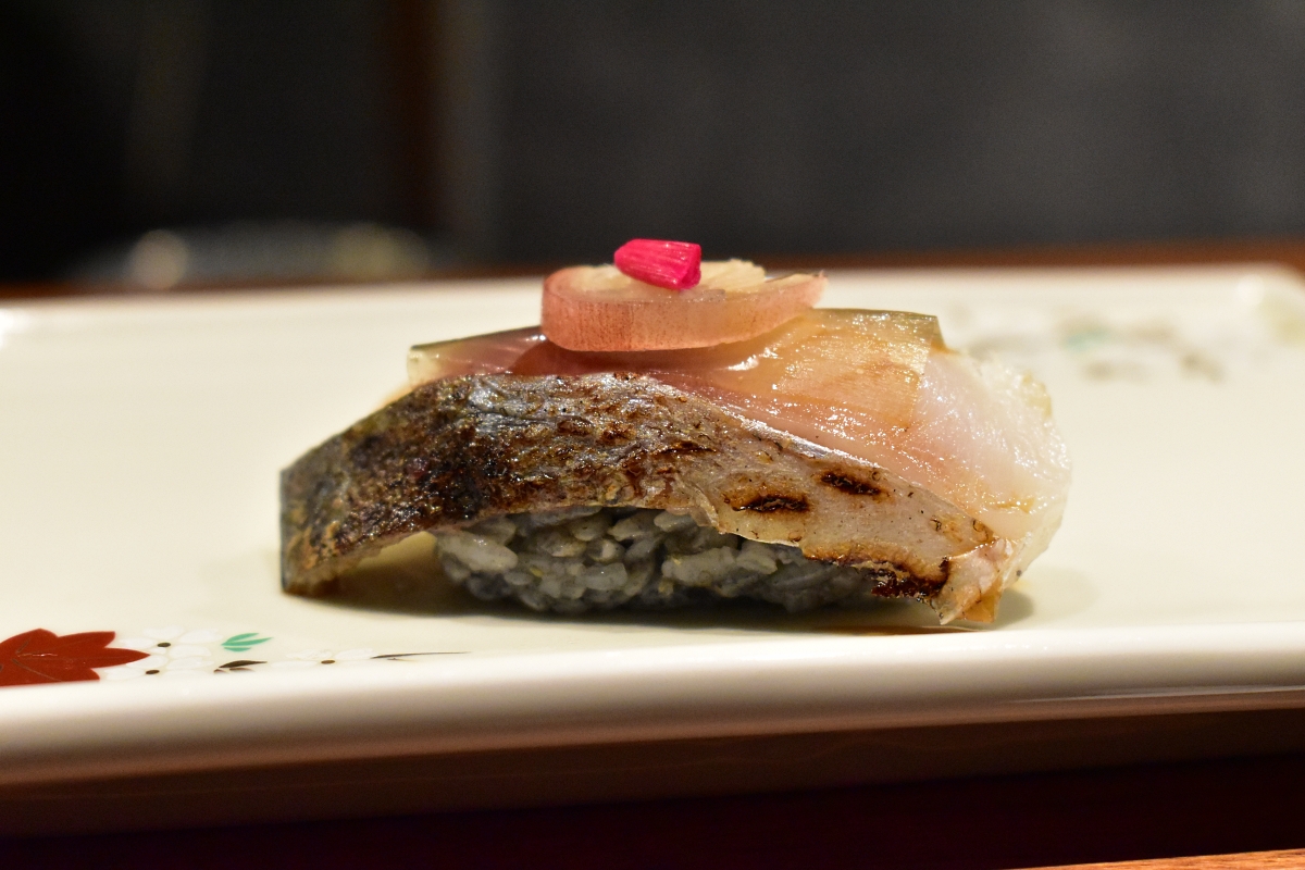 炙燒過的青花魚上頭搭配了昆布片(甜),茗荷(脆辛),筆薑(脆),