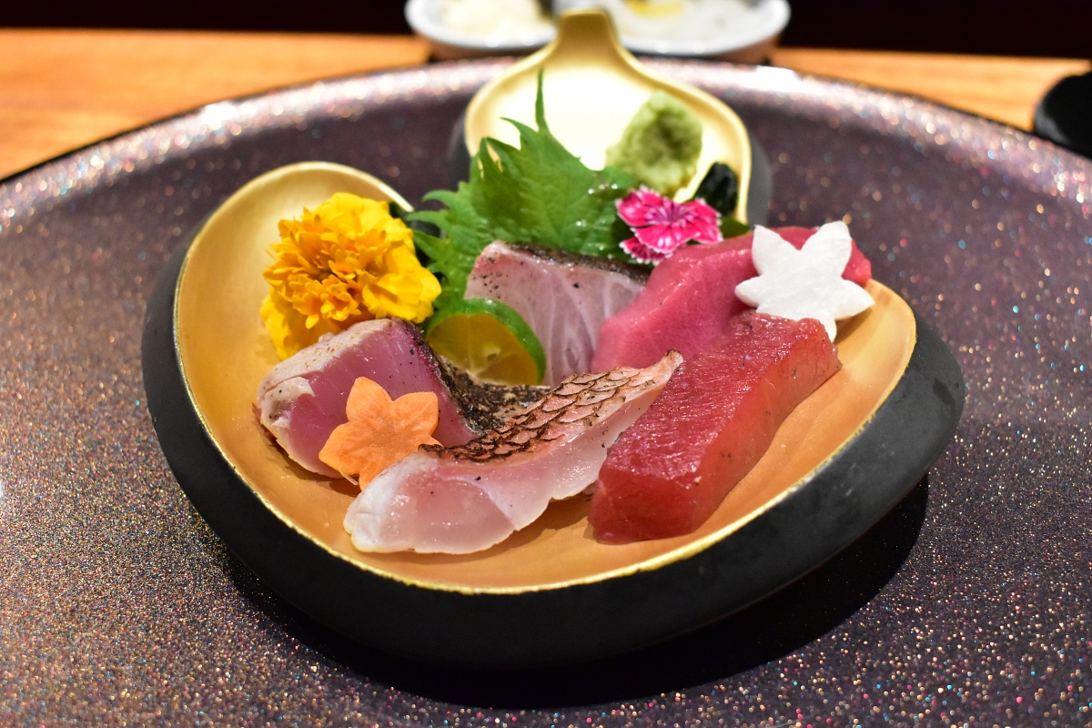 黑鮪魚赤身(右前),黑鮪魚中腹(右後),金目鯛(中前),煙仔虎(左),白甘(中後)